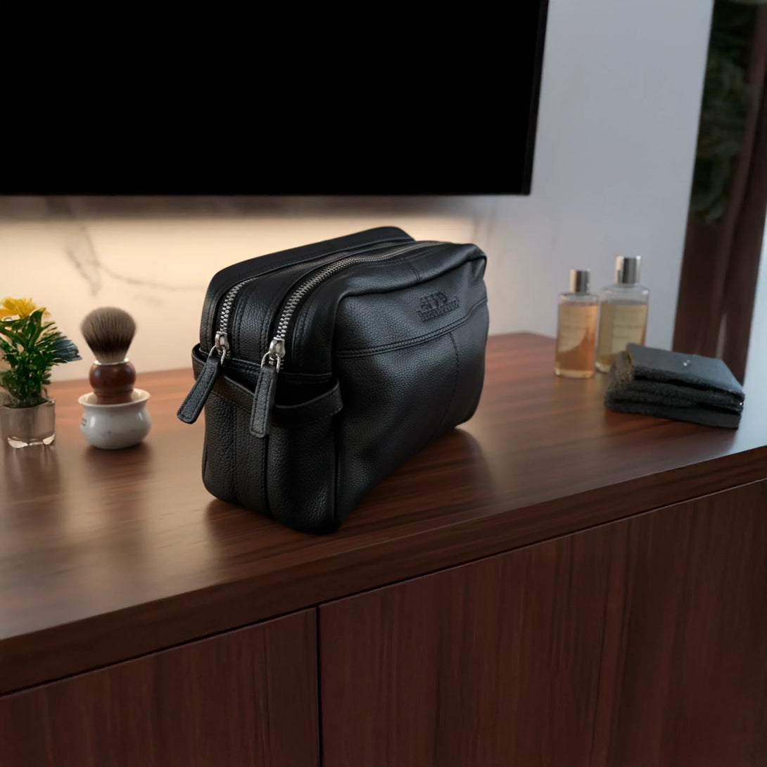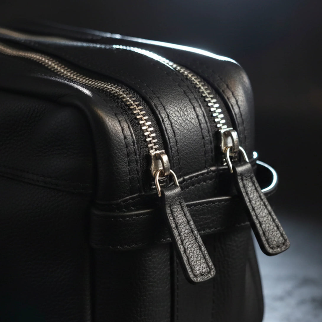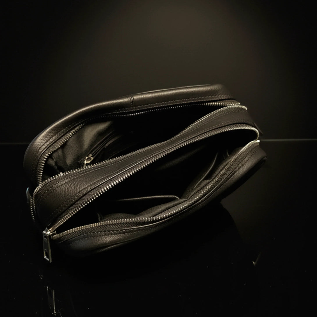 Този просторен несесер с два отделения е изработен от висококачествена естествена кожа от говежда кожа с елегантно черно покритие. Той съчетава изисканата елегантност с здрава издръжливост, което го прави перфектен спътник за пътуване.
