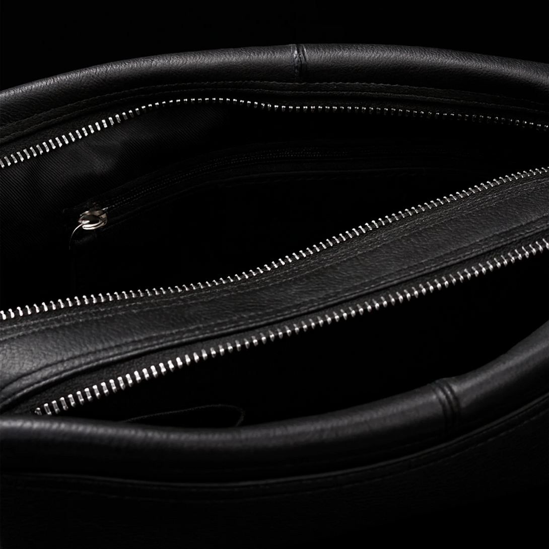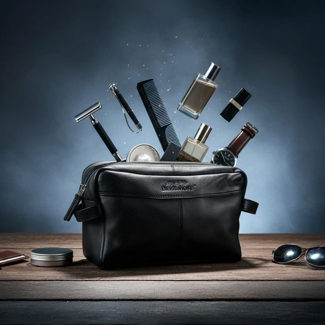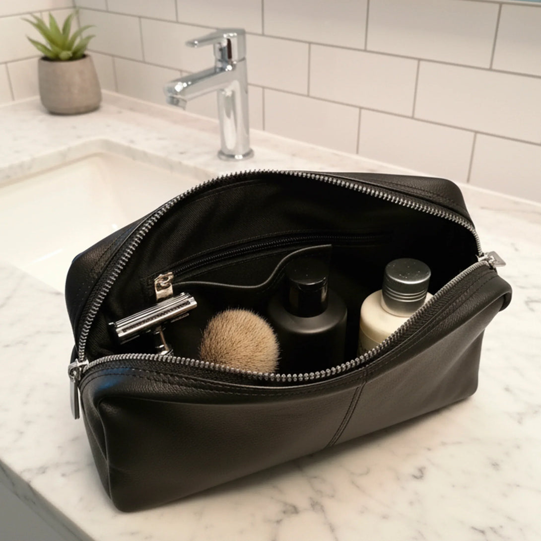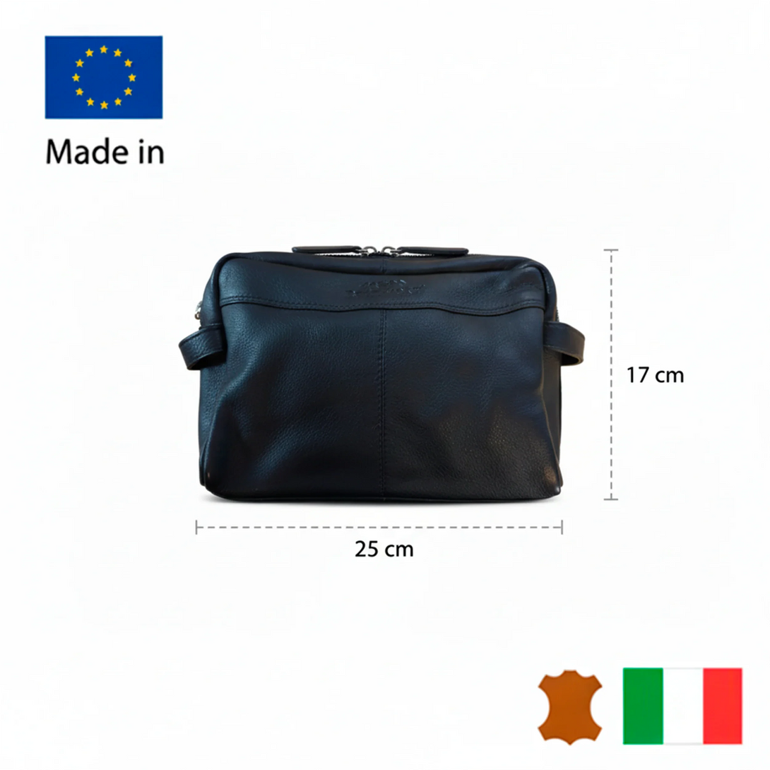 Този просторен несесер с два отделения е изработен от висококачествена естествена кожа от говежда кожа с елегантно черно покритие. Той съчетава изисканата елегантност с здрава издръжливост, което го прави перфектен спътник за пътуване.
